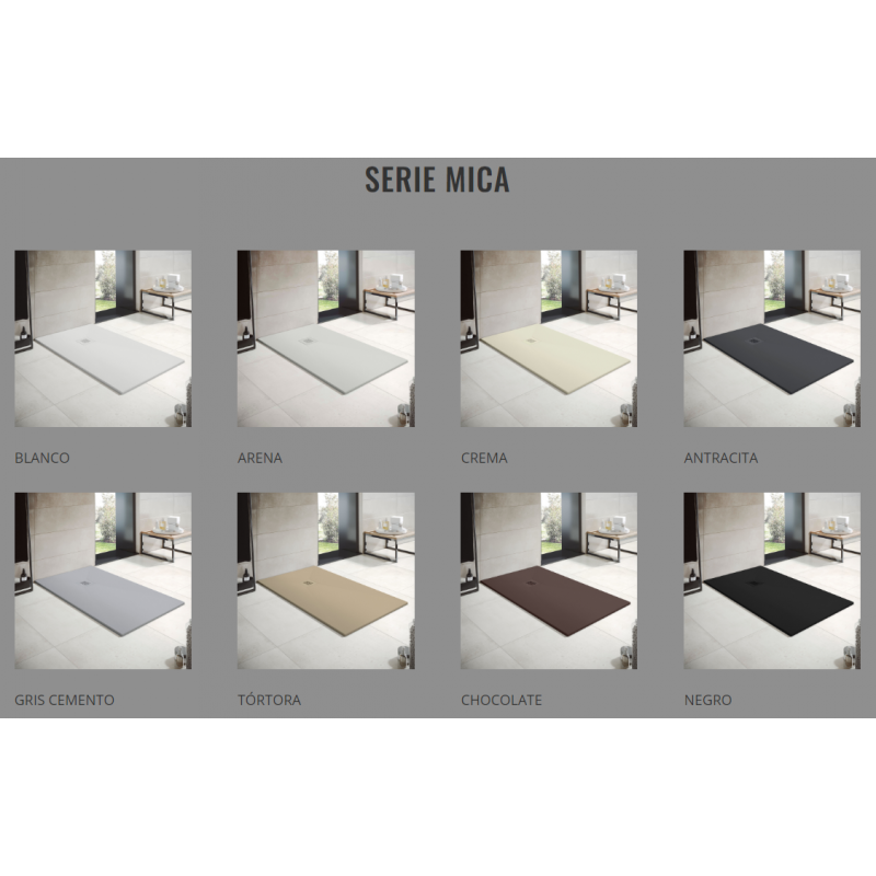 White Mica shower tray 70x80cm made of resin with lightened mineral fillers. Colored steel grille and valve included.