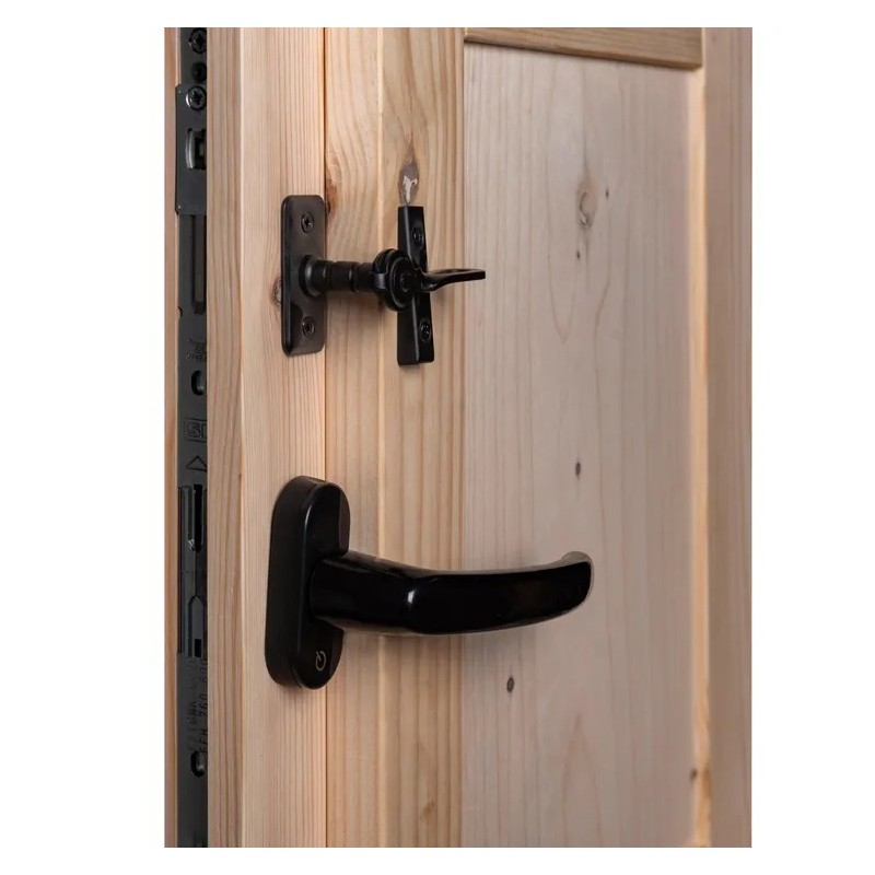 Solid pine wood window with integrated shutter. Measures 60x50cm and has a 70mm profile. Double glazing with a 4-6-4 air gap and a tilt-and-turn mechanism. Espagnolette lock: recessed in the sash, with top and bottom strike plates.