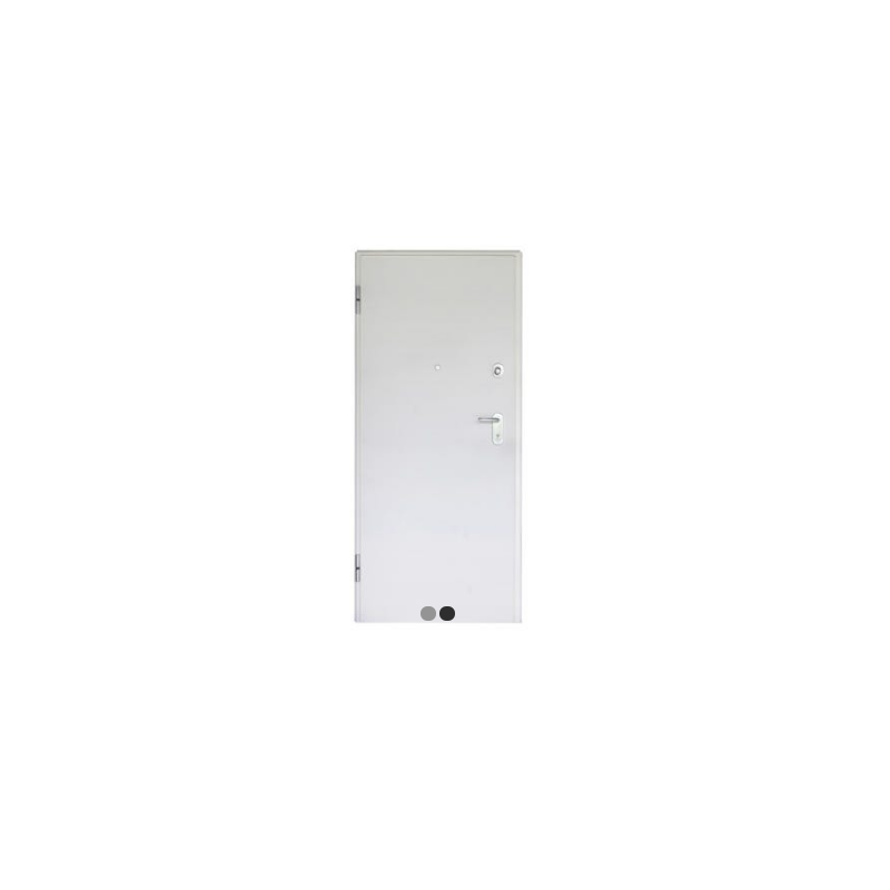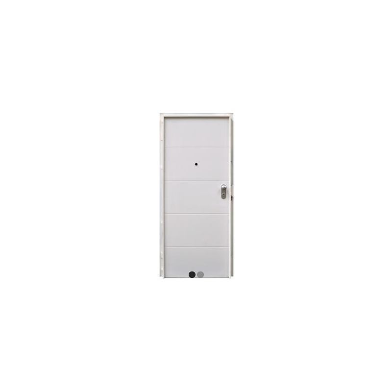 Hoja de 203 x 80 cm. Cara exterior aluminio blanco, interior lacado blanco. Premarco de acero para recibir en obra, marco de acero acabado plata y hoja de acero monochapa con 3 refuerzos verticales y sistema de cierre de 3 puntos.